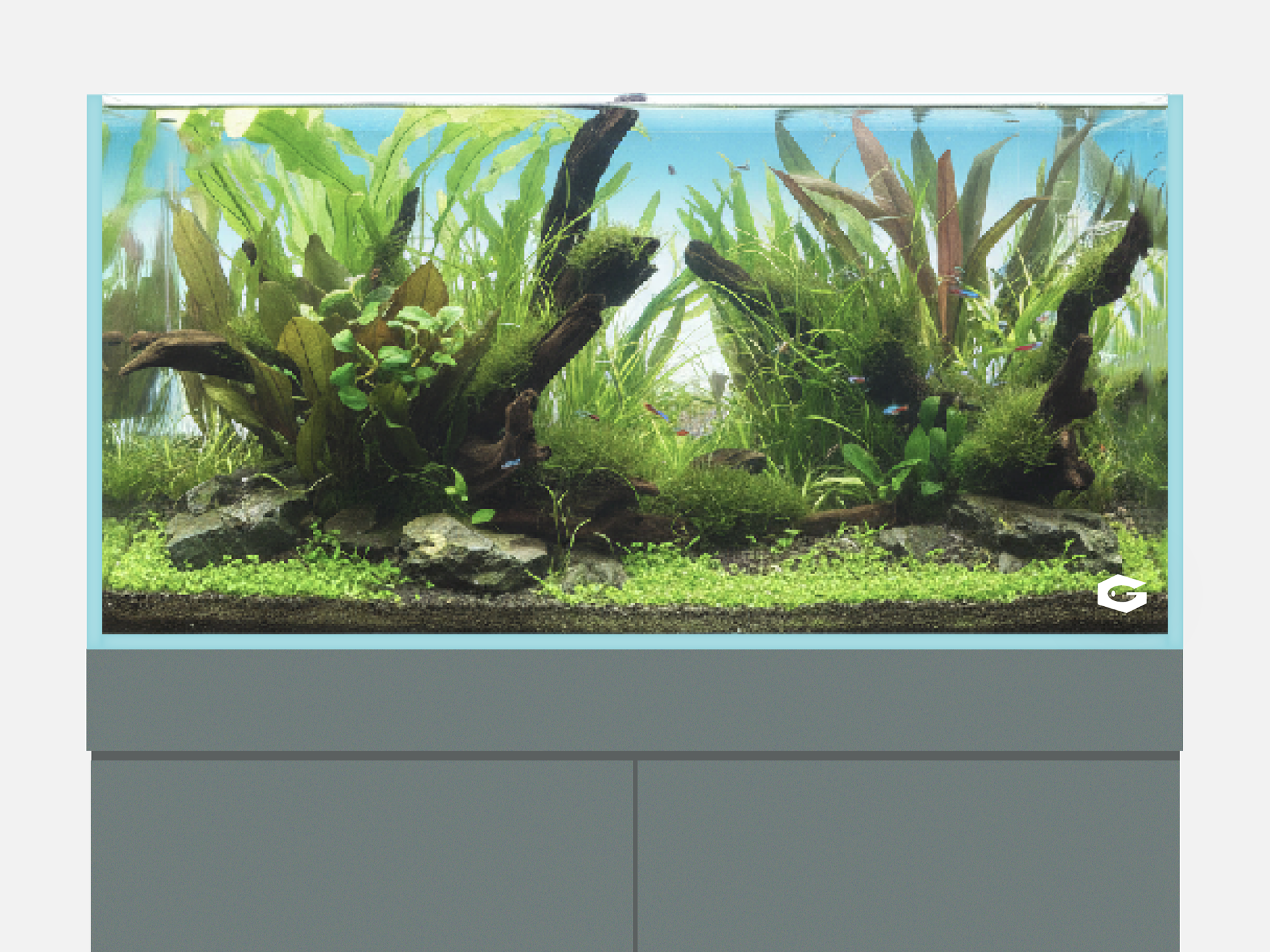 The tank and cabinet were created in Illustrator while the aquascape was generated by AI. The logo is etched onto the glass and contrasts with the substrate layer.
