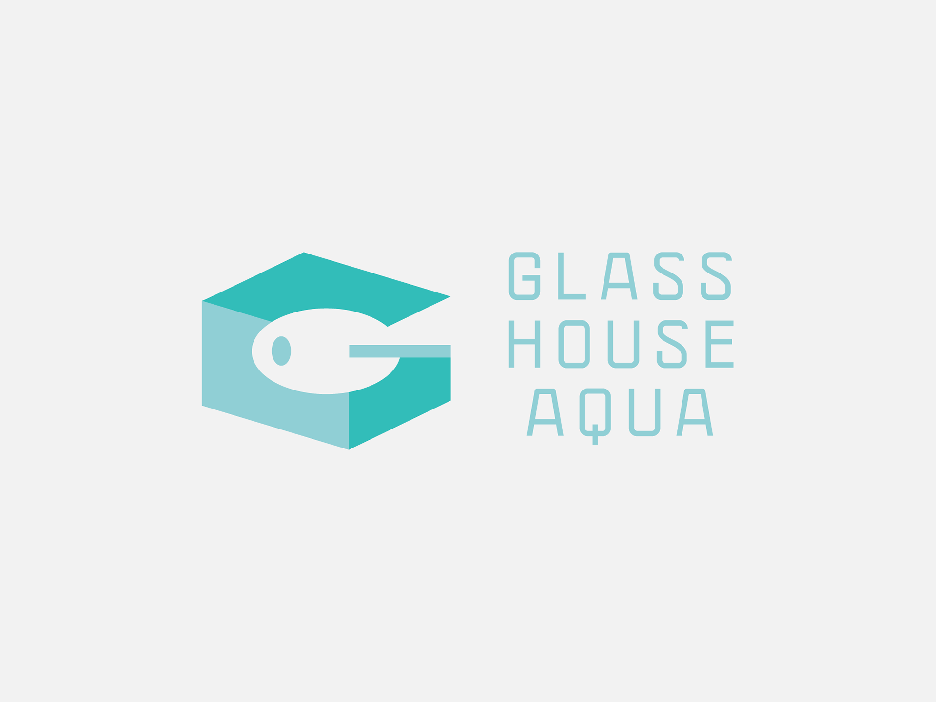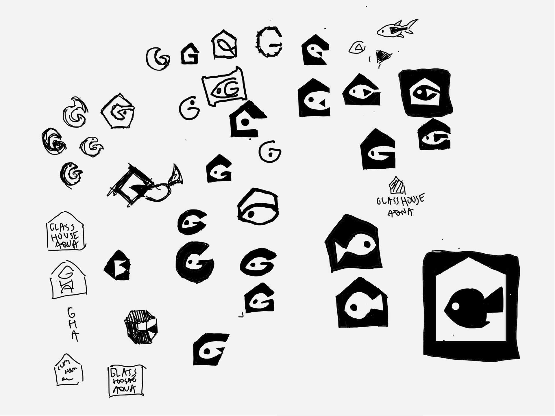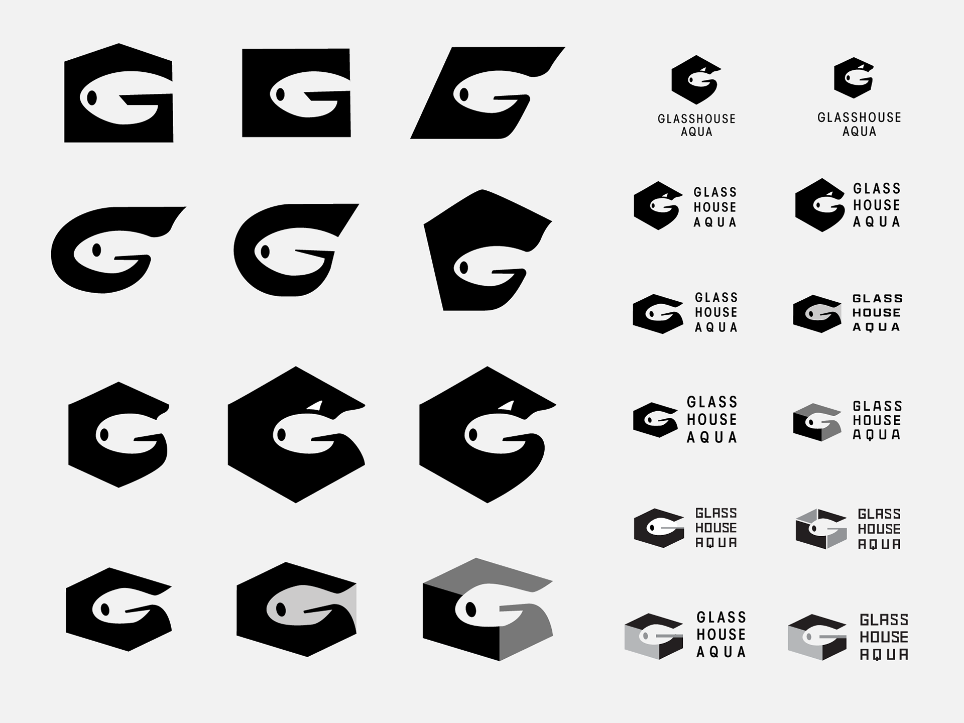 Vector iterations — The evolution of the home/G motif from a house to an aquarium viewed from a top corner angle. The fish was inspired by the espei rasbora, with its characteristic black line running down its body.